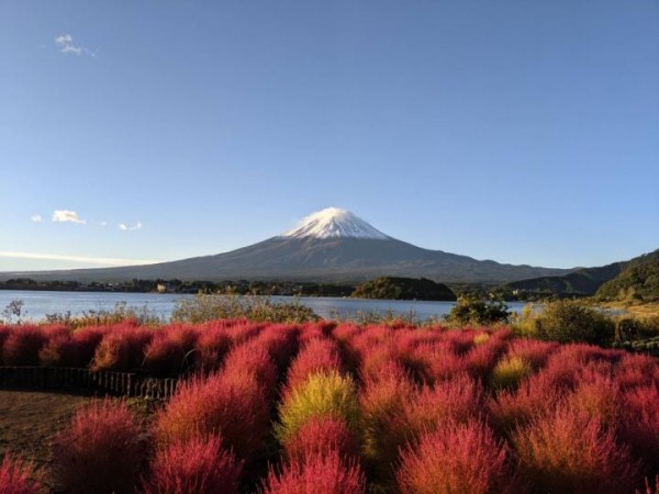 富士山を背景に広がる真っ赤なコキアが、秋ならではの特別な光景を作り出します。