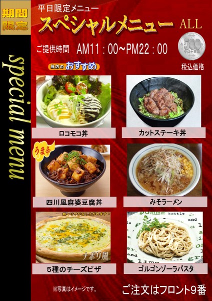 平日限定で丼、ラーメン、パスタ、ピザなどが、なんと驚きのワンコインで召し上がれます!