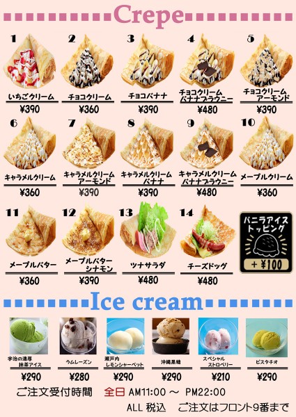 クレープとアイスクリームも種類豊富に取り揃えております。