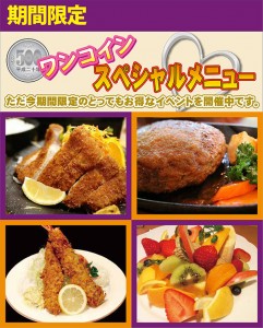 ただ今期間限定のと~ってもお得なイベント開催中!ワンコインで満足、スペシャルメニューをぜひご堪能ください♪ -