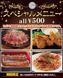ALL500円のスペシャルメニューが登場!大人気ローストビーフからうな重など、本格的なお料理がワンコインでお楽しみいただけます。 -