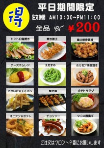 ただ今、期間限定でなんと!『平日全品200円』メニューが登場★注文可能時間AM10:00~PM11:00 -